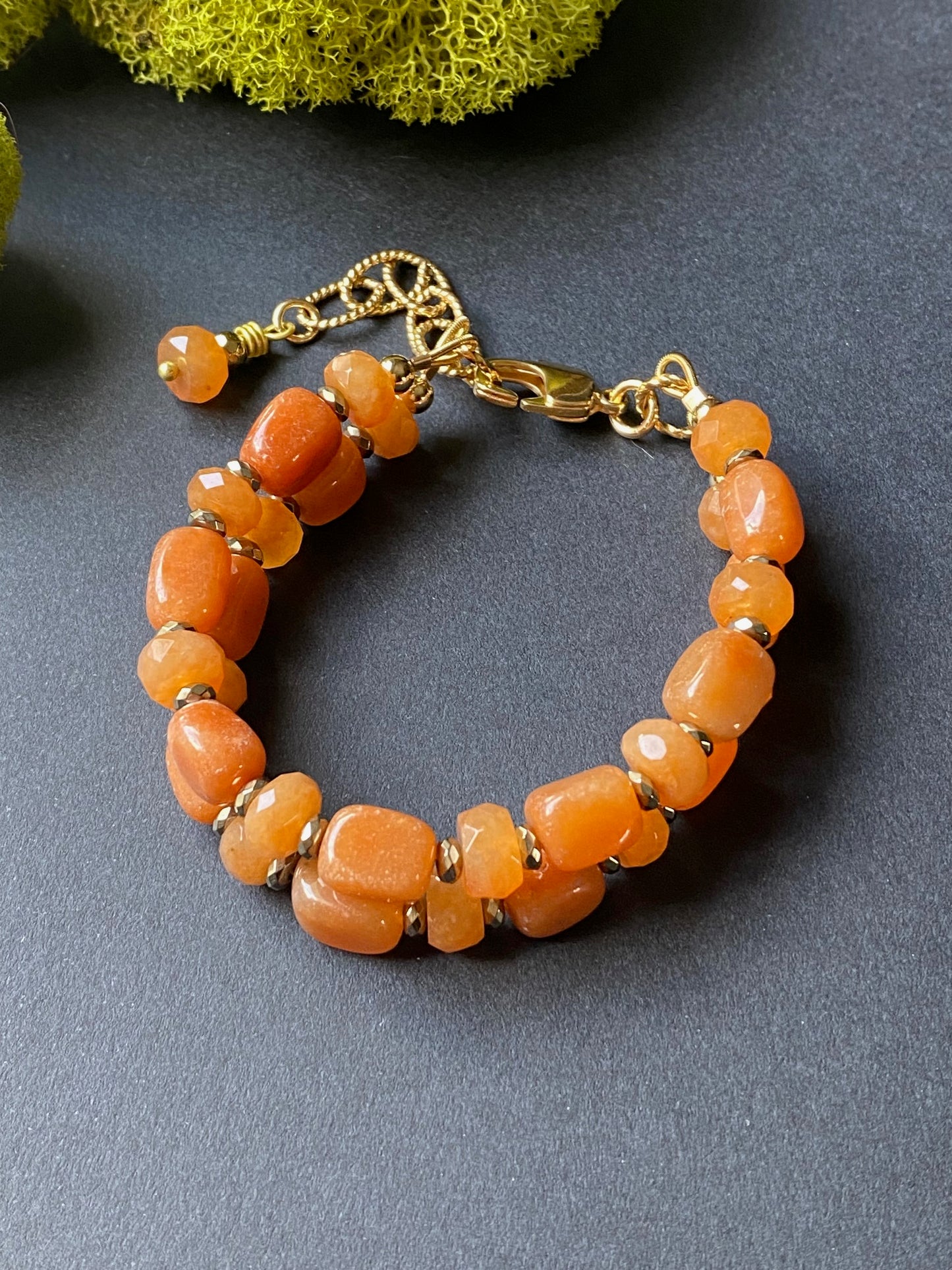 This lovely piece features smooth Carnelian nuggets, Carnelian Rondelles, Faceted Pyrite,14K Gold filled Beads and Gold Plated Crab Claps and accents. The perfect layering bracelet, it also looks beautiful all on its own.