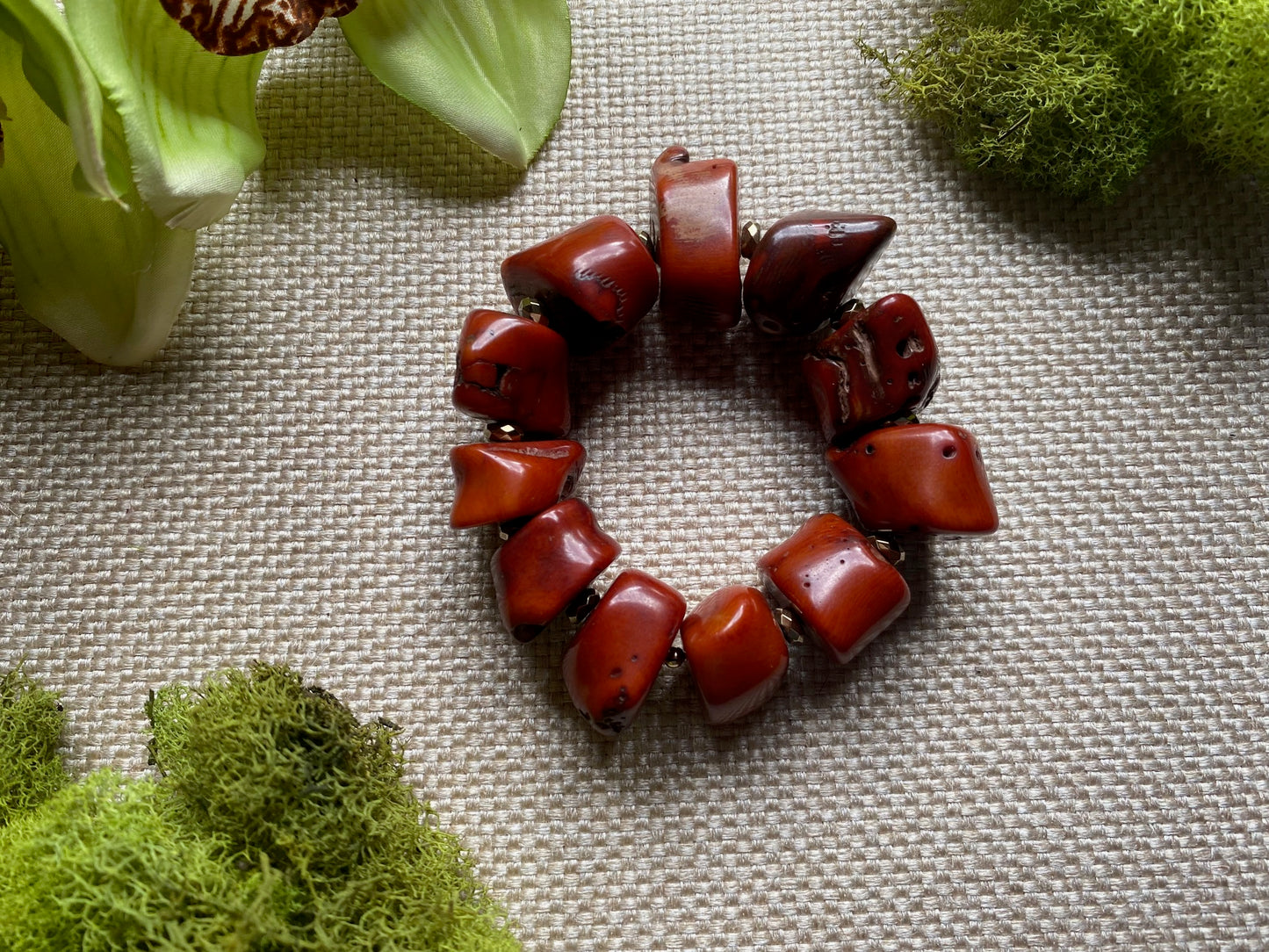 This classic Essential Boho chunky stacker is comprised of Coral highlighted by faceted Pyrite accents. Super chic all on its own, as part of a Tribal Glam stack or with a mix of chunky chain bracelets.