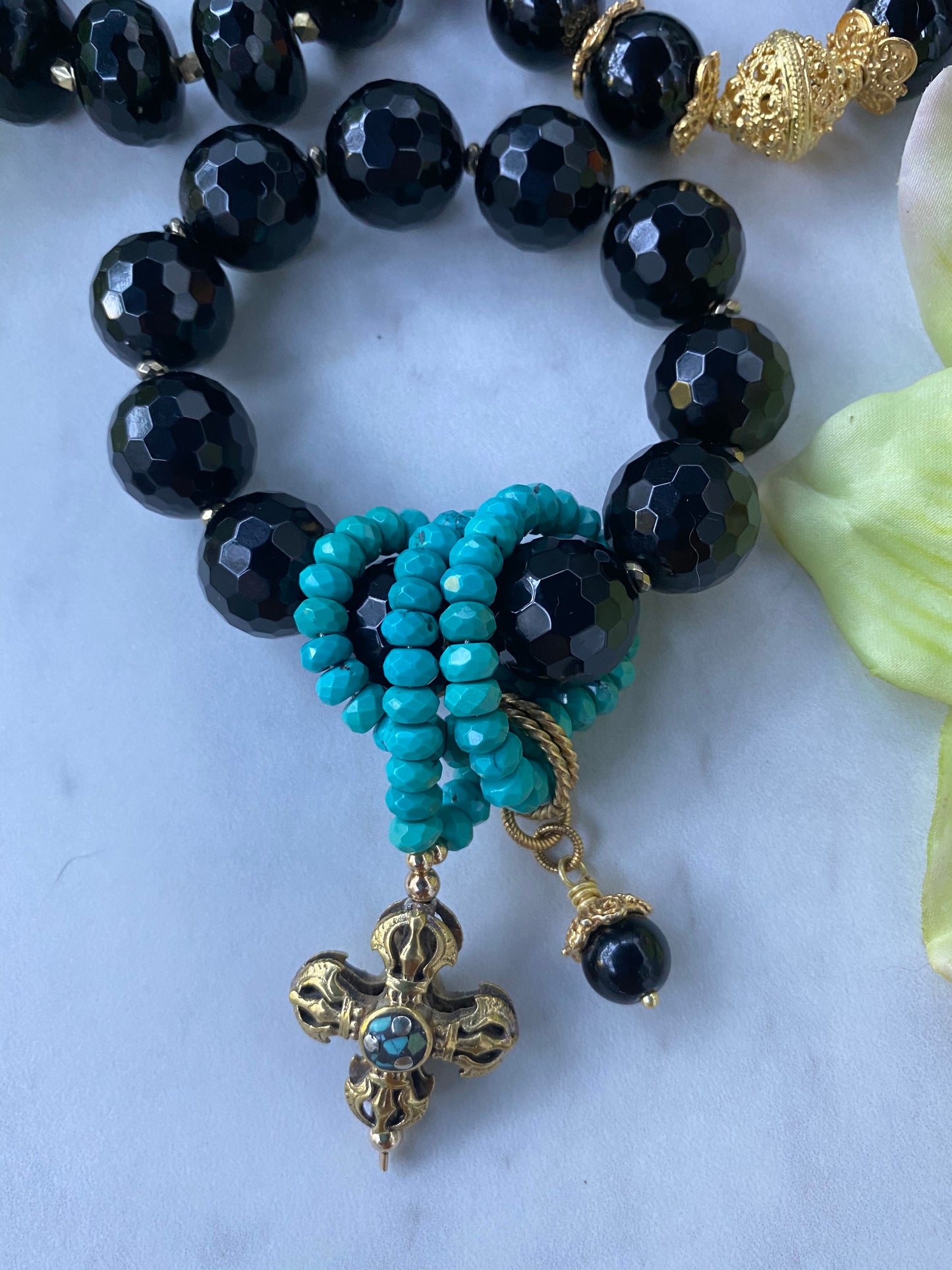 Our signature Wrapture Bracelet in flawless 18mm Onyx highlighted by our signature gemstone wrap comprised of AAA faceted turquoise rondelles. Featuring a Double Dorje and Onyx charms.