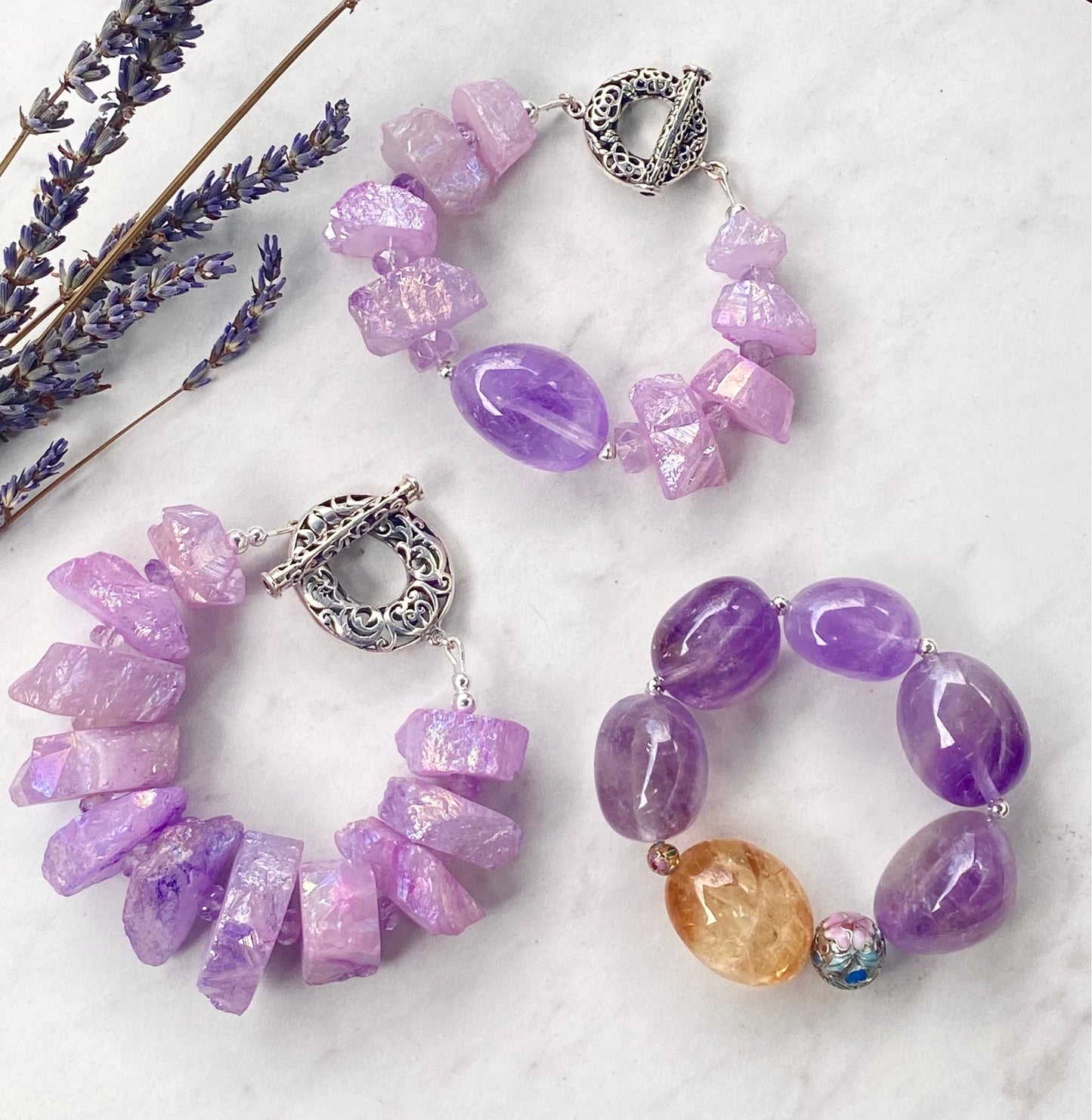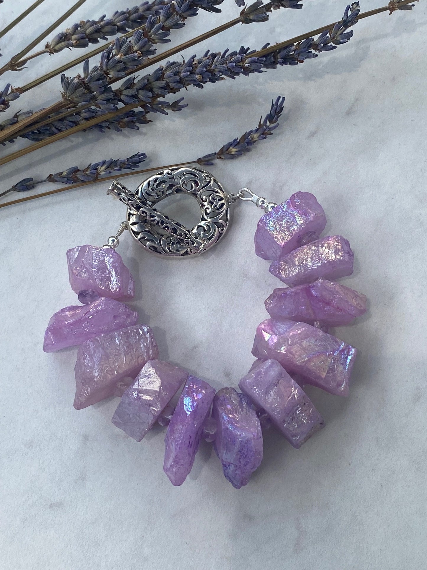 This chunky beauty is definitely one of those eye catching statement pieces. The juxtaposition of the extra large, rough nuggets and faceted Ametrine rondelles against the ornate, oversized Filigree Sterling Silver Toggle Clasp makes this such a standout, special piece.